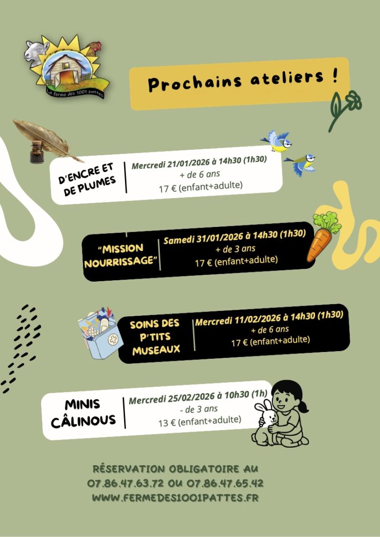 Les inscriptions sont obligatoires pour tous les ateliers, inscrivez vous par téléphone au 07.86.47.63.72 ou en envoyant un email à contact@fermedes1001pattes.fr